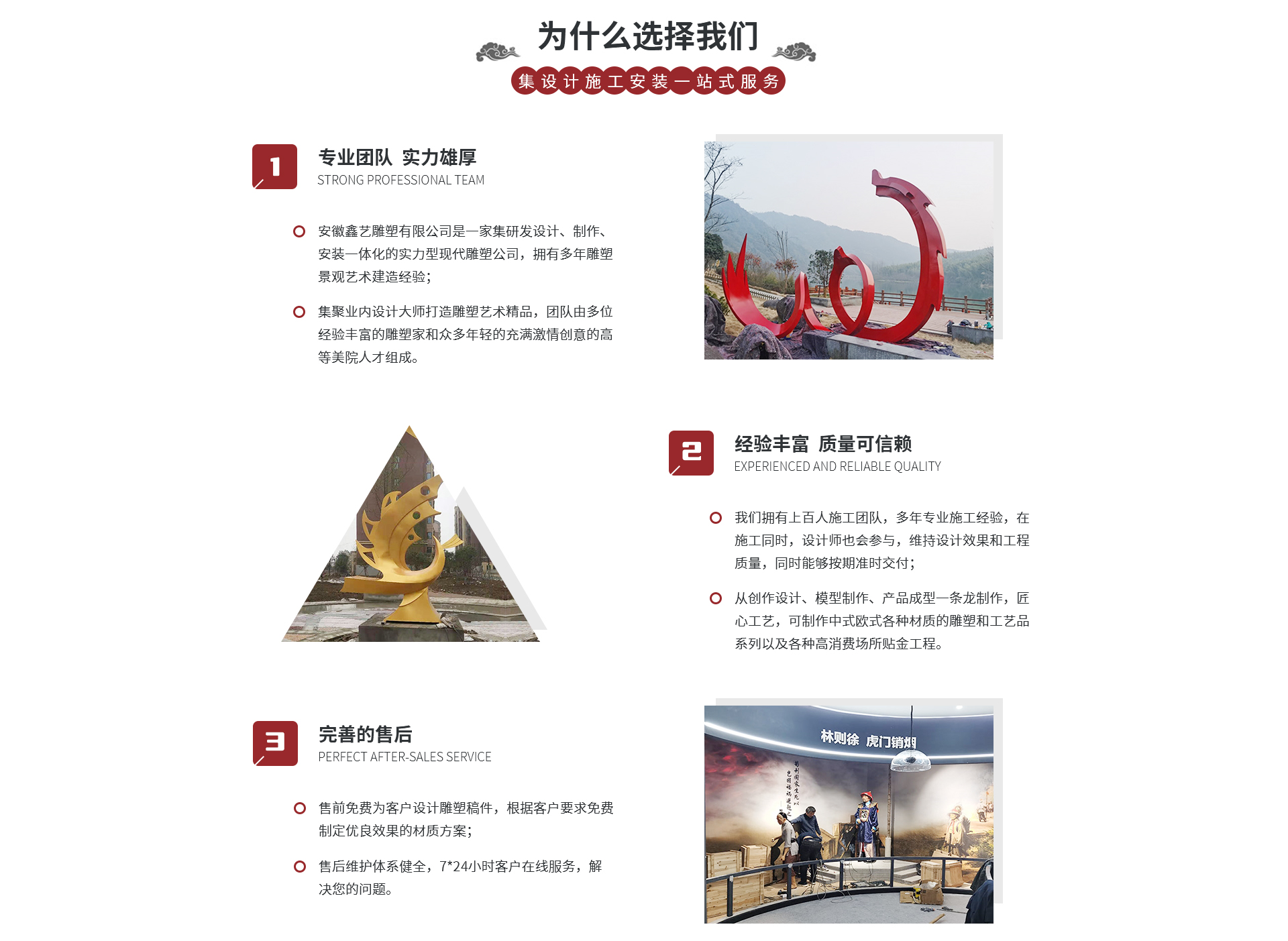安徽鑫藝雕塑有限公司 是一家集研發設計、制作、安裝一體化的實力型現代雕塑公司。公司重視城市發展環境,追求空間與創意性建筑的結合,團隊擁有眾多雕塑設計師。創作設計、模型制作、產品成型一條龍制作工藝,可制作中式、歐式各種材質的雕塑和工藝品系列(砂巖、漢白玉、琉璃造型、樹脂透花等),以及各種高消費場所貼金工程。業務區域:合肥雕塑公司、安徽浮雕公司、合肥浮雕制作、合肥雕塑制作、安徽雕塑制作、合肥雕塑廠、合...